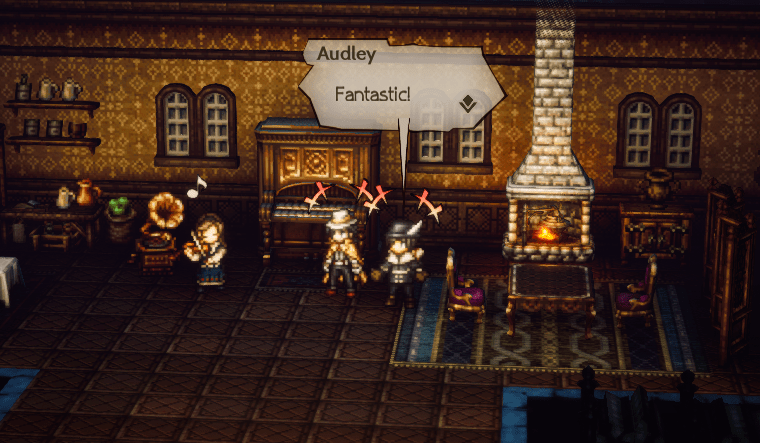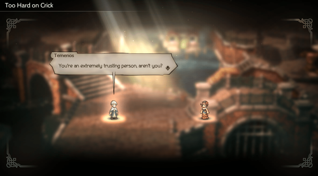 From your character’s footsteps to the menu interaction sounds, the game has a satisfying sound for everything which helps provide some nice auditory feedback. The characters have voice-acted combat lines to go along with your FIREBALLS and their character-to-character interactions. Cut scenes utilize the same graphic and sound quality you see in the rest of the game as well, which keeps the quality and tone consistent. The voice acting is emotive and layered with fitting background music and ambient noise. Cut scenes feel serious and each aspect of the included audio lends to that feeling. Tone of voice, crisp ambient noise to match actions, and crescendo’s of music all play their part. So far, Octopath II has been one of the few games I did not have Spotify running in the background for, and it has been very refreshing. If you ever need background music for something, I recommend giving the Octopath II soundtrack a go, because it has a little something to fit every situation.