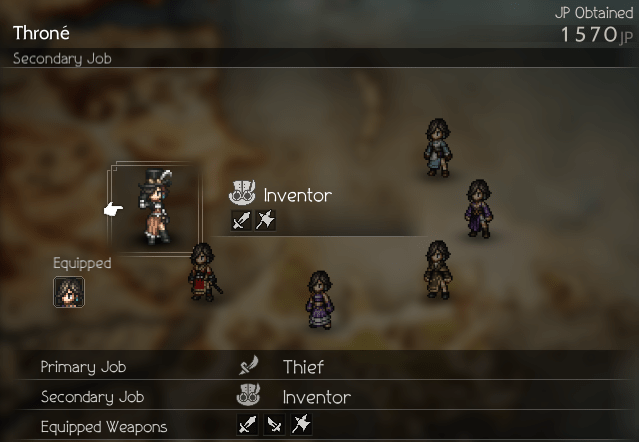 As you explore, you will find additional customization in the form of Secondary Jobs. These are sub-classes for your travelers that are unlocked by finding training stations throughout the world. You can turn your young Dancer into a Scholar, Thief into an Inventor, grizzled old Scholar into a Dancer, whatever you desire. There is enough variation to scratch that sweet, sweet min-maxing itch. I particularly enjoyed trying to fit my favorite characters into my party to maintain combat effectiveness, usefulness while in town, and my own made-up reasons for the characters to be sticking together.